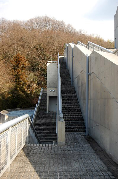 写真左の駐車場から緩やかに弧を描く壁をつたい、階段広場を抜け、階段広場を斜めに貫いた通路を抜けると建物のメインエントランスにたどり着く