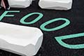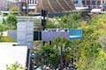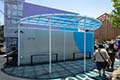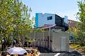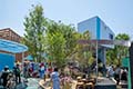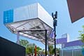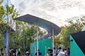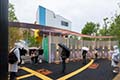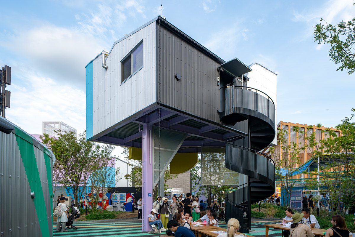 小さな建物が連続する敷地内。ピクトグラムやサイン、テーブル・イス、自販機や植栽が建築の一部となり、周囲の環境に溶け込む。