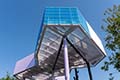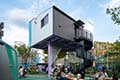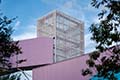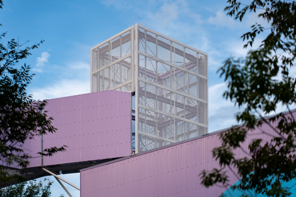 静けさの森に隣接する彩り豊かな小さな建築群。飲食スペースをはじめ、トイレや情報機能、機械室、応急手当室を併設する。