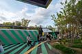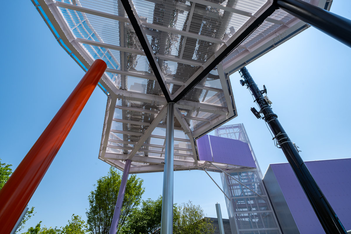 建築は複数の棟の間に生まれる半屋外の連続空間を主役に据える。柱を幹、上部フレームを枝に見立てた木造+鉄骨の混構造は、日差しを遮り通風を生む。テーブルや椅子は点在配置とし、短時間の休息から軽食、待ち合わせまで用途を限定しない。各棟の仕上げや色調は抑制的だが、サインや自販機、近接施設をも巻き込む「色と形の流れ」を計画上のモチーフとし、建築の輪郭がランドスケープへと滲むことを意図している。