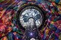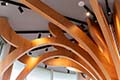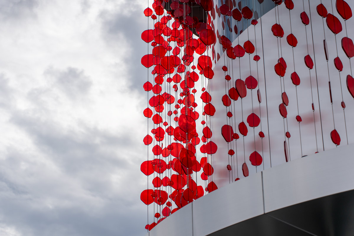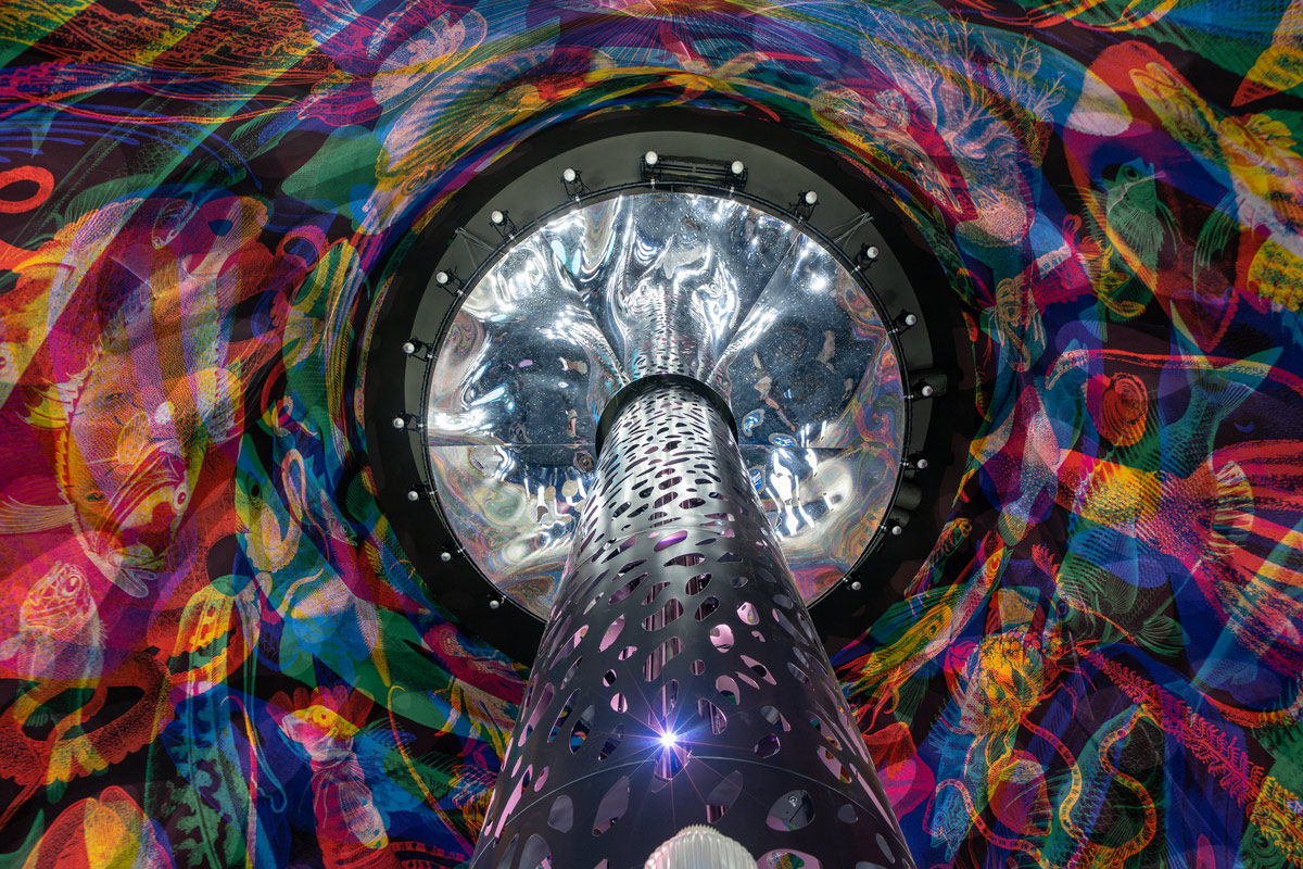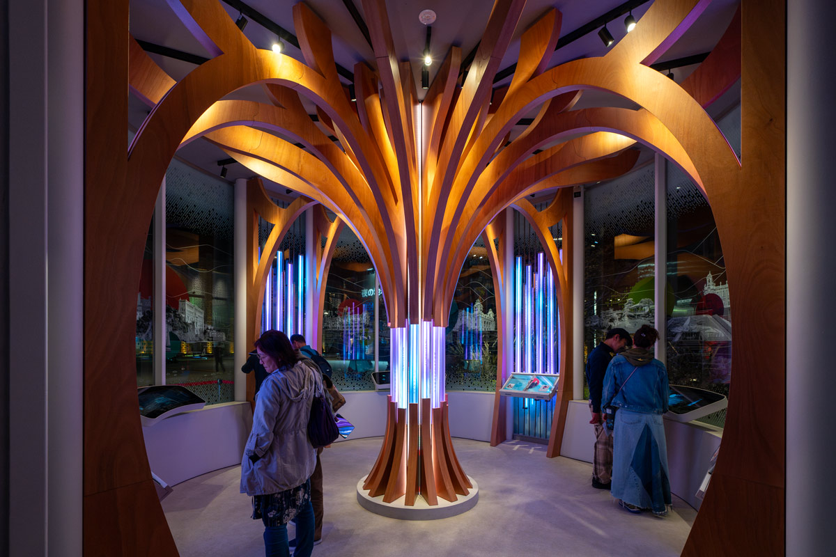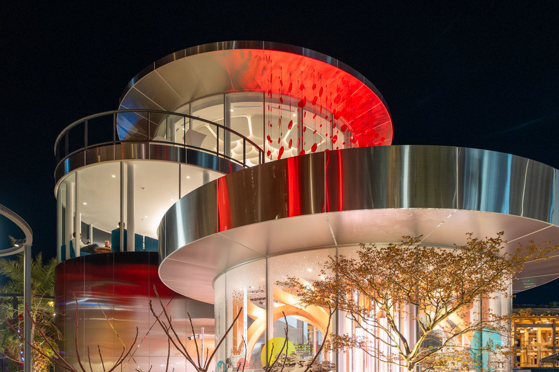 建物は鉄骨造を主体に一部鉄筋コンクリート造を併用し、吹抜けの主空間に演出設備を統合する。内部ではRGBの色フィルタで表現が切り替わる壁画や、生分解性素材に由来する3Dプリント照明が環境配慮と表現性を両立。
