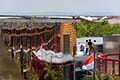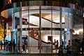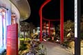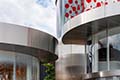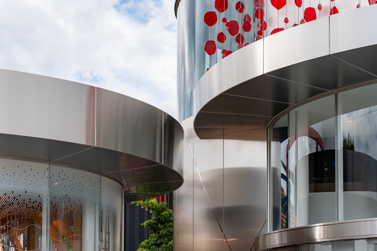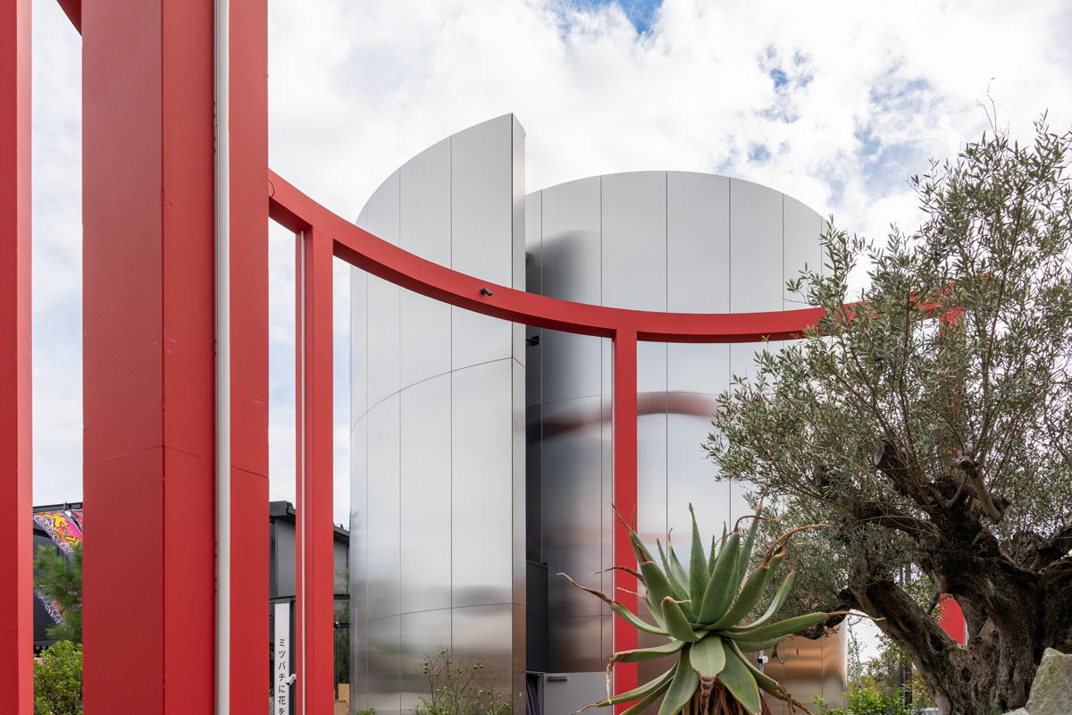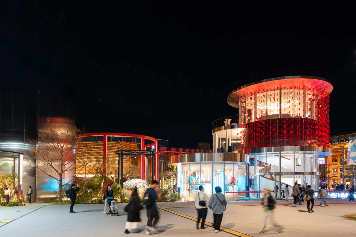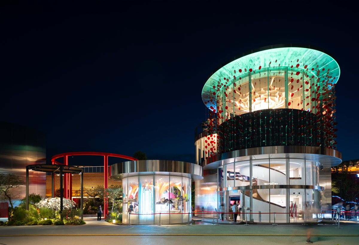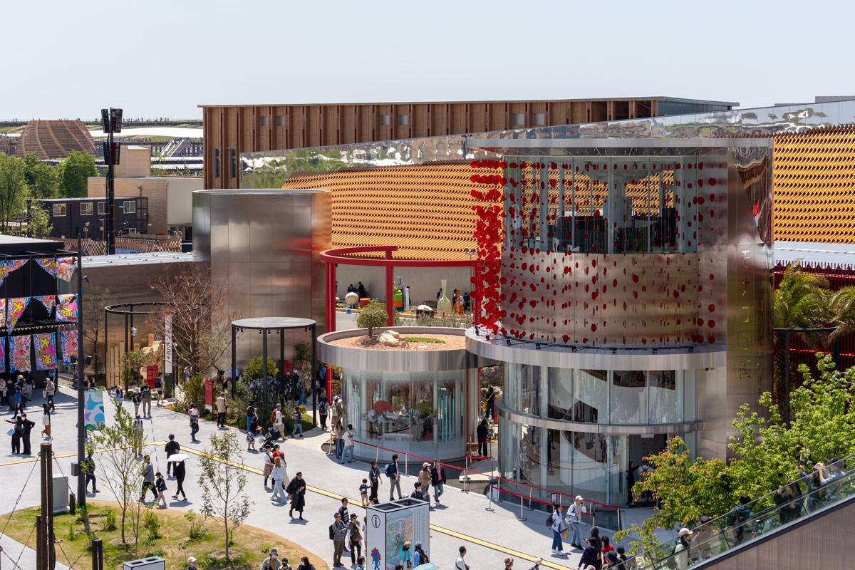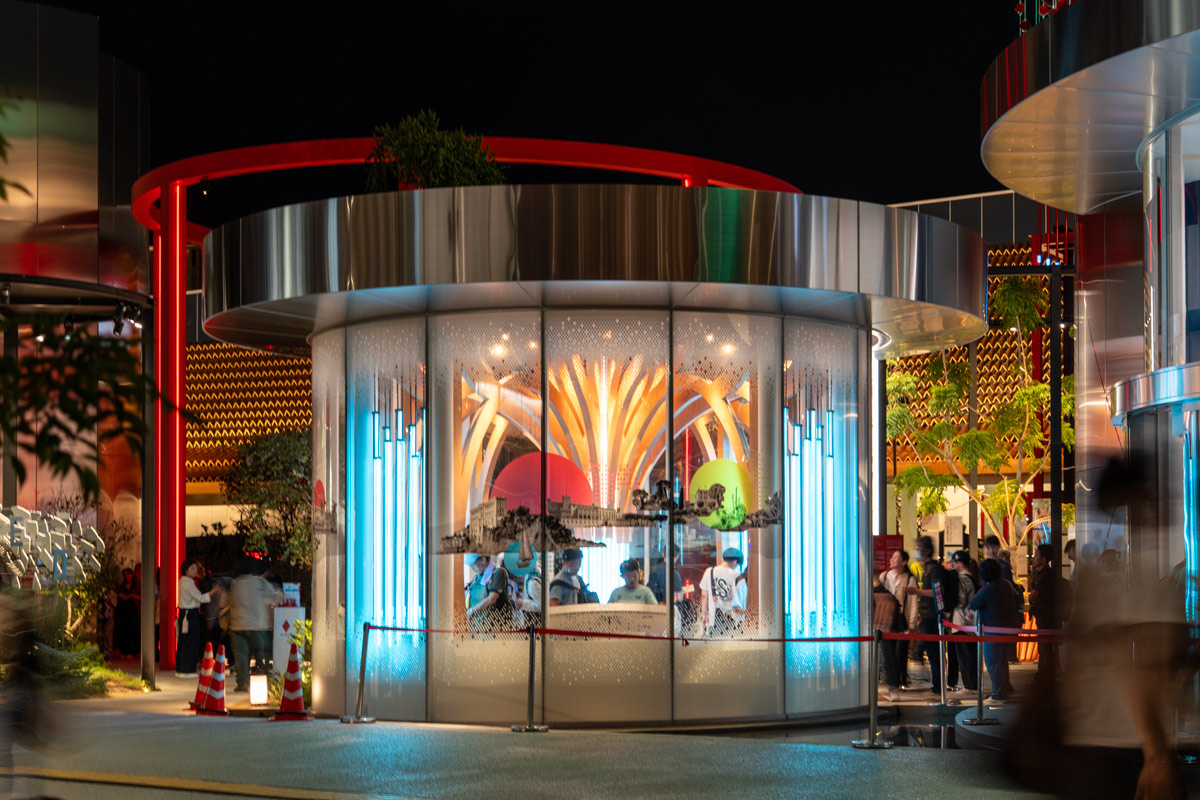 モナコパビリオンは、小規模ゆえにデザイン性の高い単独テナントのようにも見える。遠目に効くサイン、鏡面と光演出による“見せる”外装、館内のワインバーやラウンジ的滞在は、ブティックや体験型フラッグシップを想起させる要因だが、本質は「庭園—建築—展示」を束ねて体現する点にあり、現代的なリテールの言語を上手く借りている形。これが万博ではなく街中にあれば大きく人目を引く存在だっただろう。