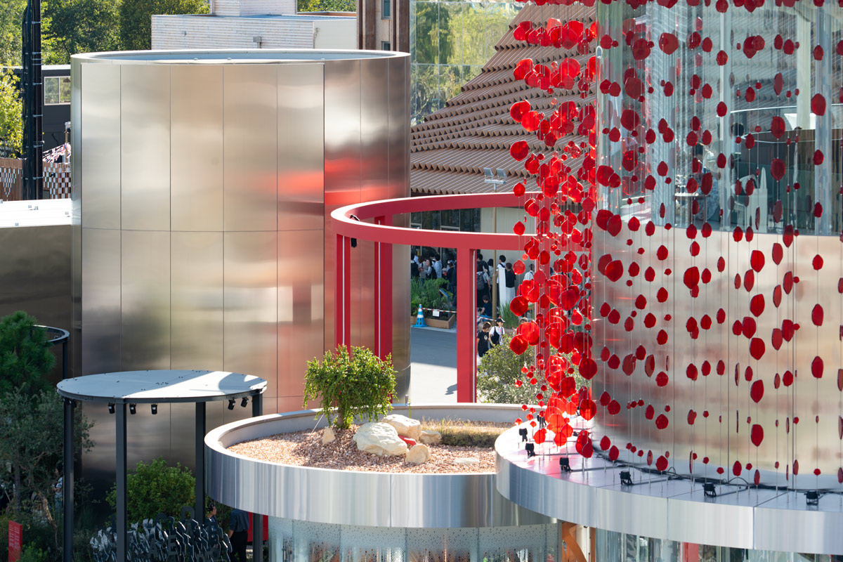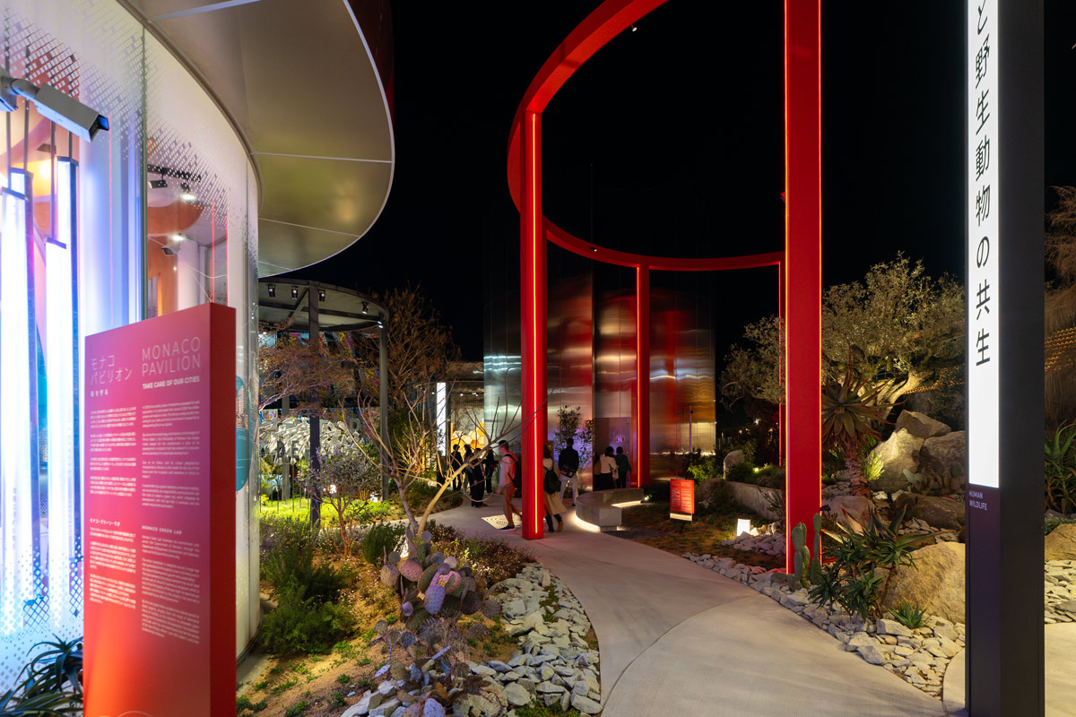 モナコパビリオンは「Take Care of Wonder(驚きを大切に)」をテーマに、建築とランドスケープが一体となった空間構成。円形を基調とした建築デザインと、庭園的要素を融合させることで、訪問者が自然に溶け込むような体験を提供しつつ、展示テーマである環境意識を空間的にも体現している。