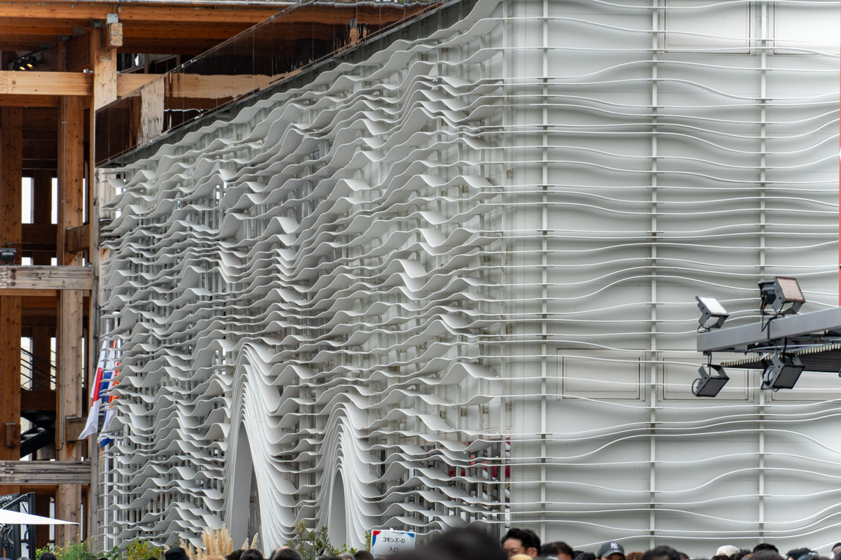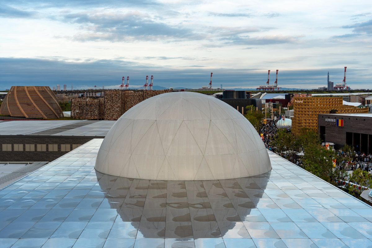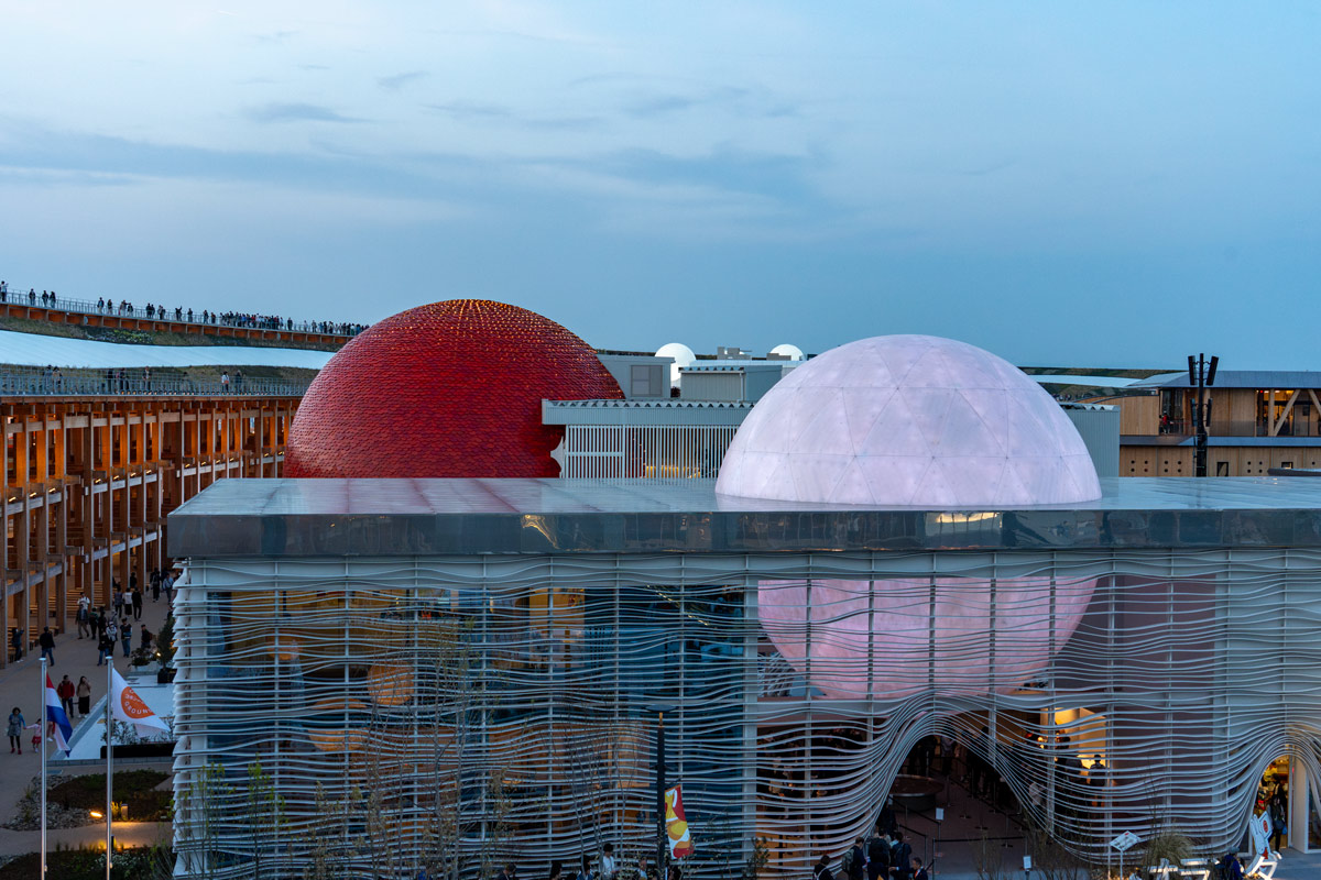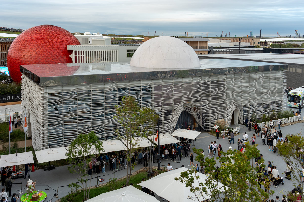 屋根を貫く直径10メートルを超える球体と波型ファサードにより、クリーンエネルギーの幕開けを「太陽」と「水」で表現したオランダ館。設計はオランダを拠点にするRAU Architects。