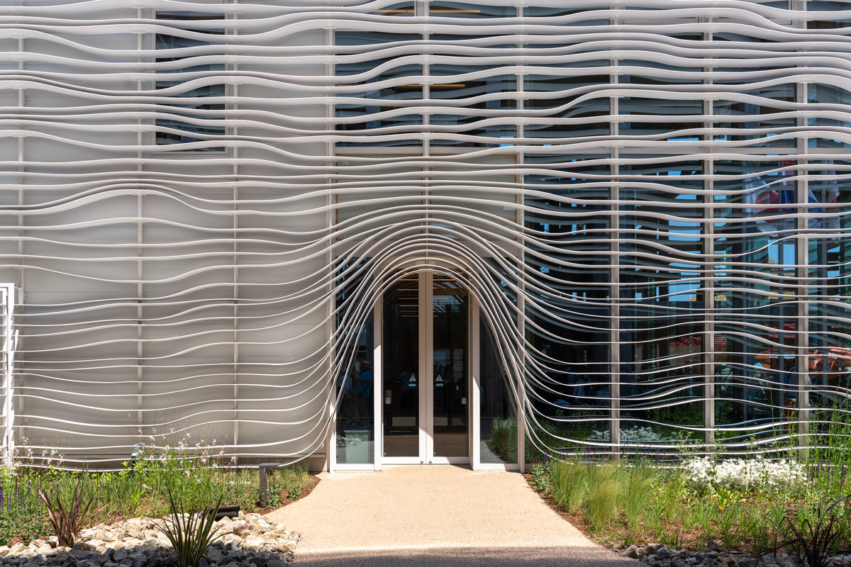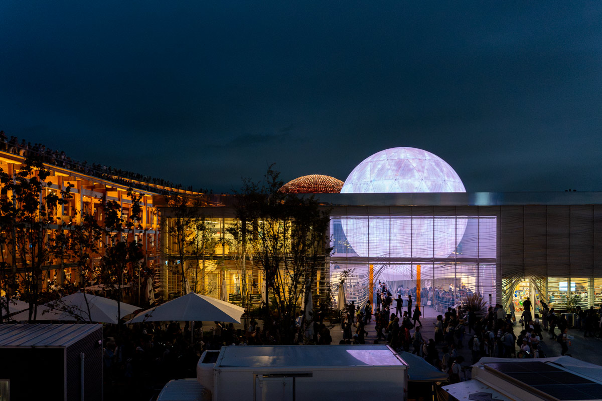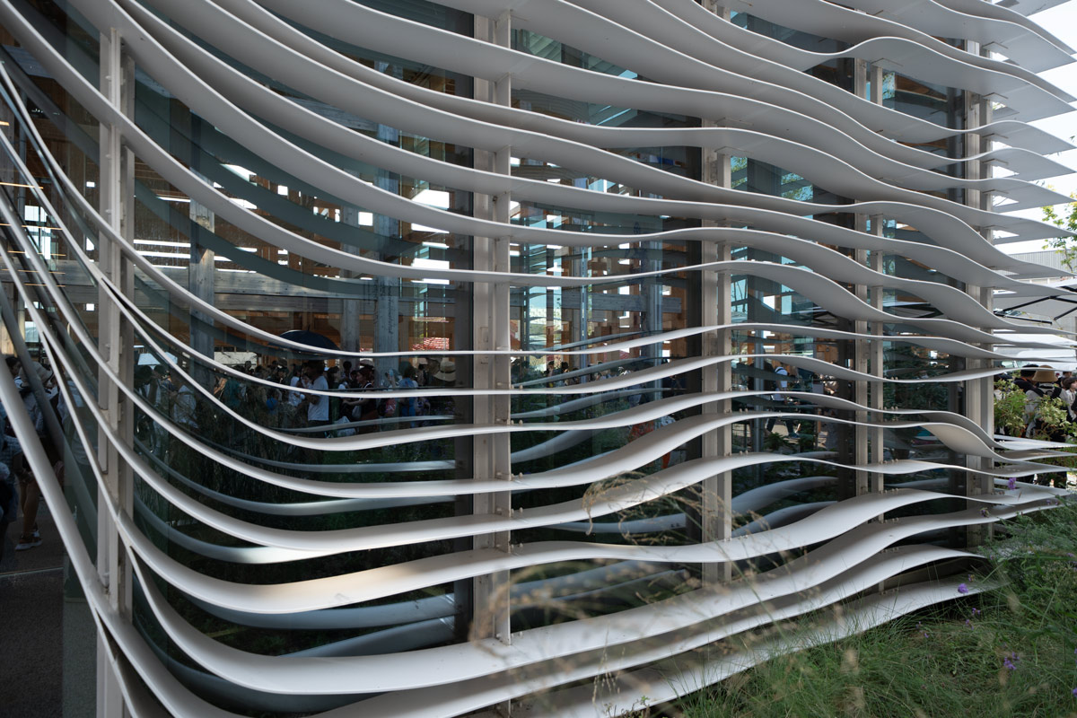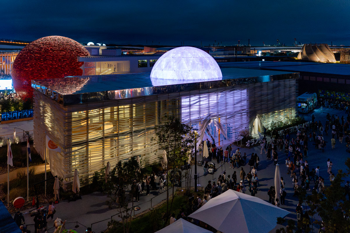 屋根を貫く直径10メートルを超える球体と波型ファサードにより、クリーンエネルギーの幕開けを「太陽」と「水」で表現したオランダ館。設計はオランダを拠点にするRAU Architects。