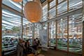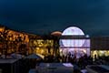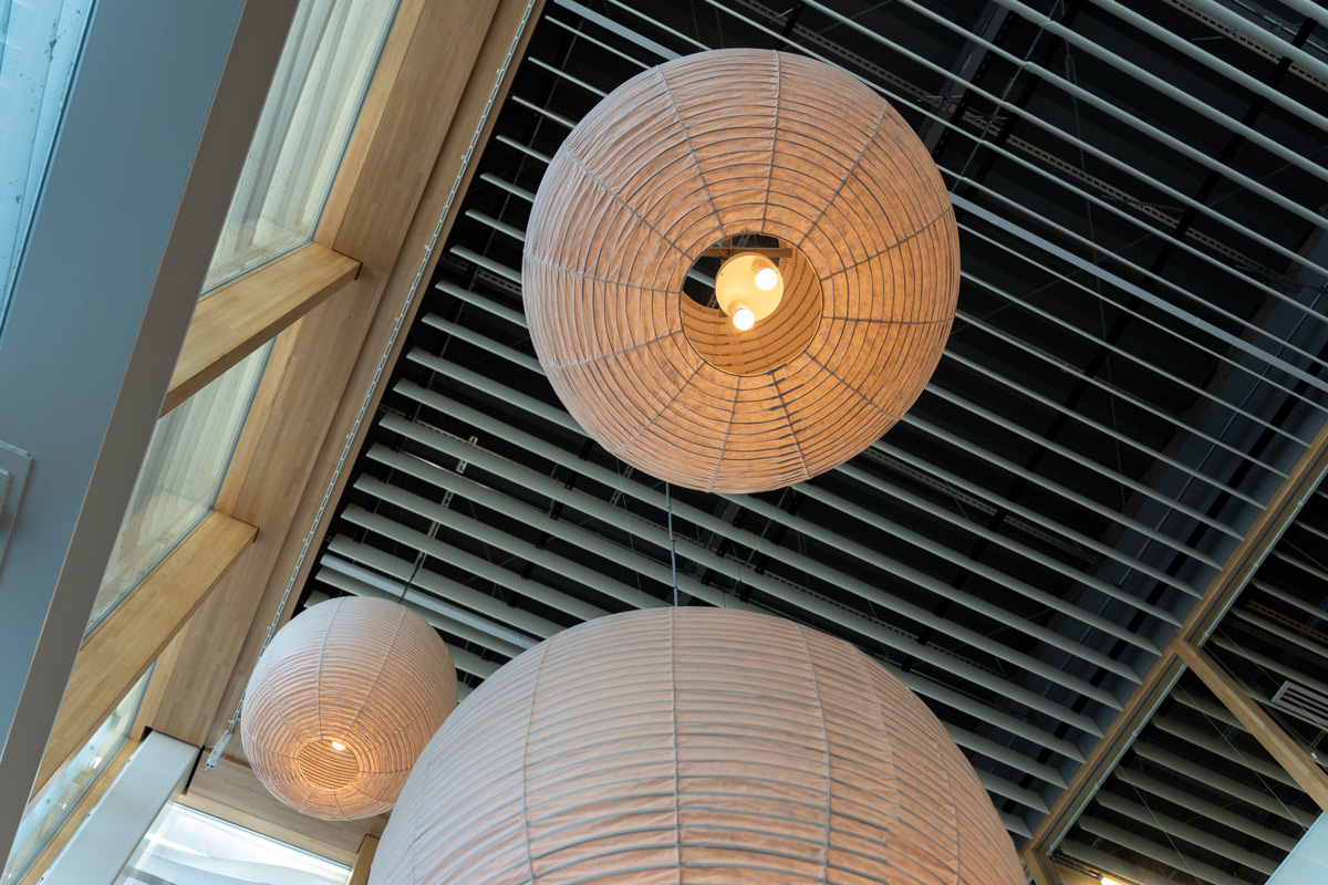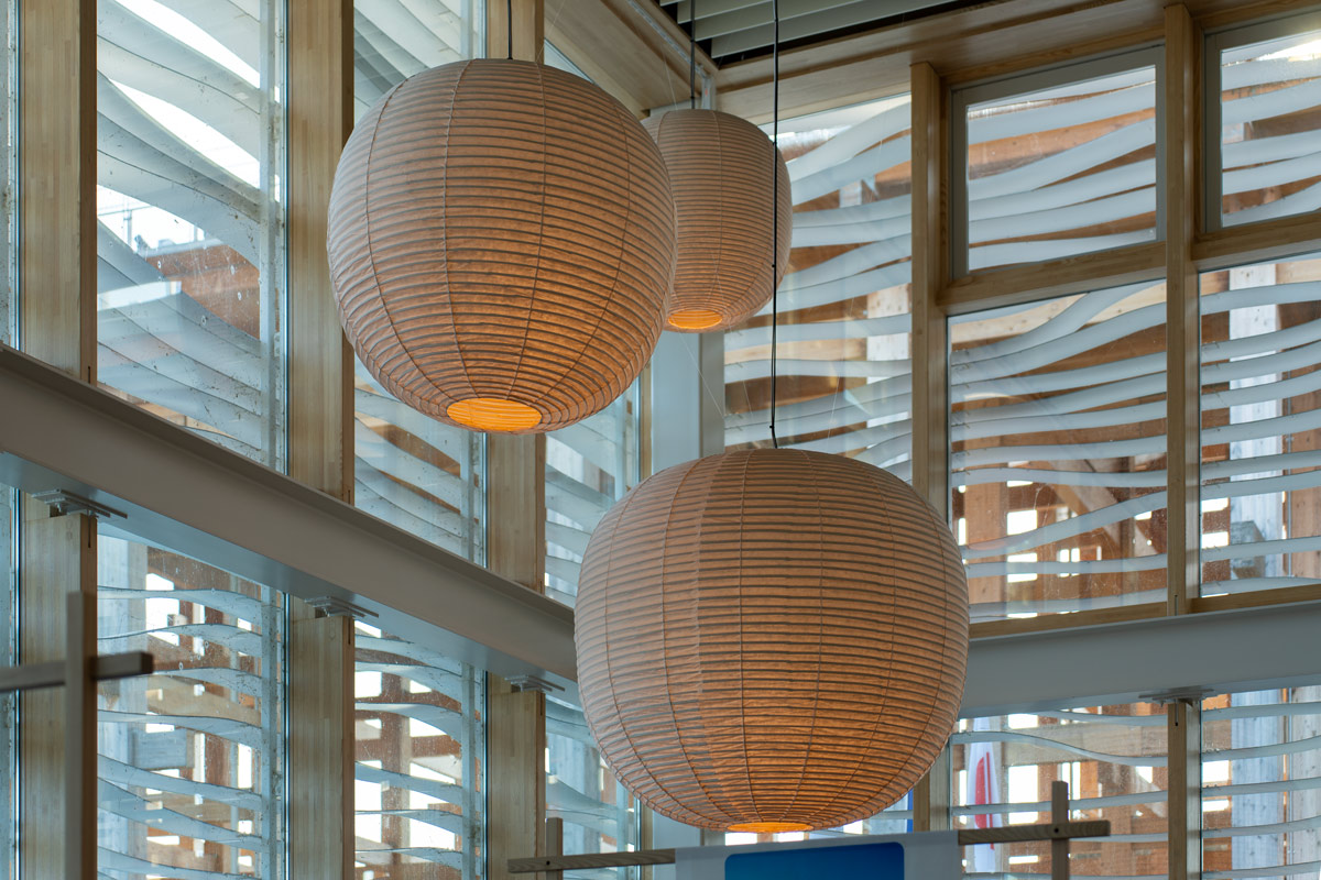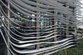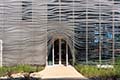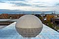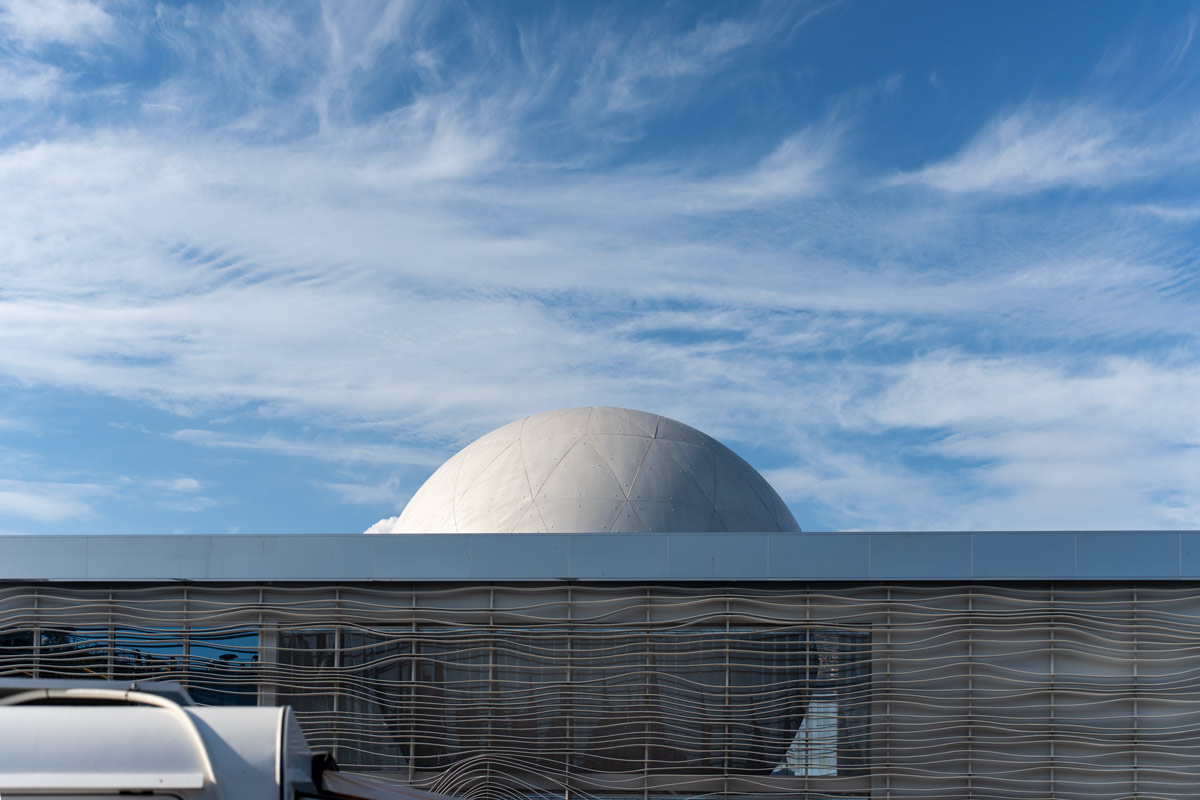 外装は板状のFRPが波のようにうねり、水流を表現。屋根は鏡面RVS板仕上げとし、上空やグランドリングからも完全な球として認識できるよう工夫された。