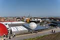 大屋根リングからオランダ館を見る。鏡面仕上げの屋根に反射し、中心の球体を擬似的に表現。