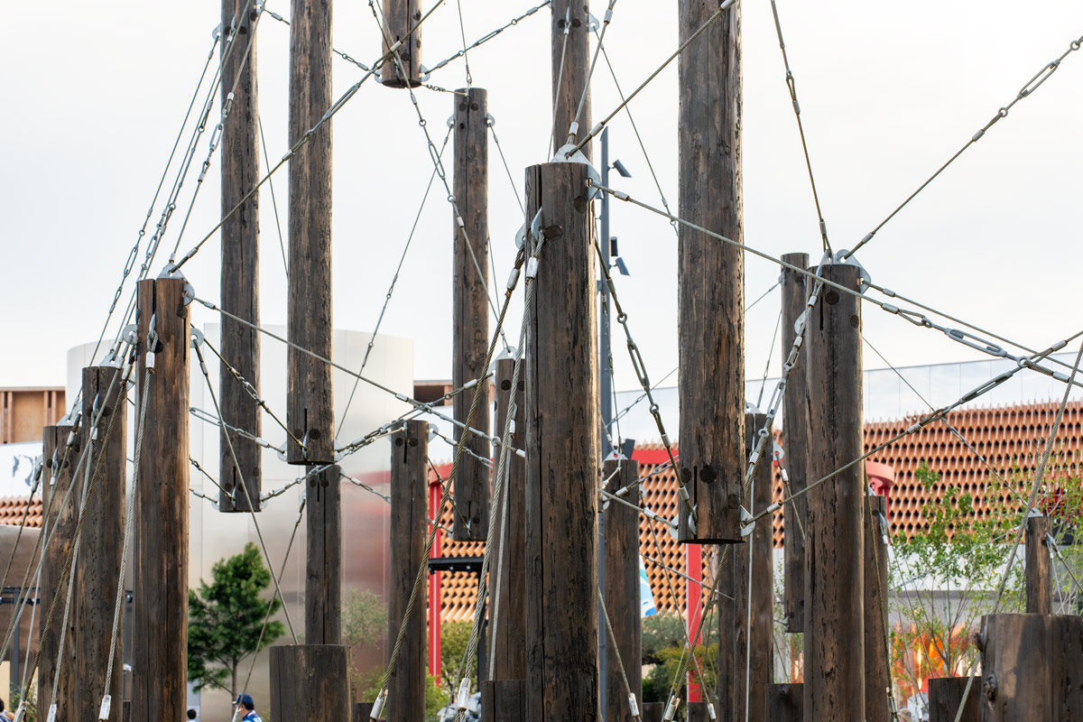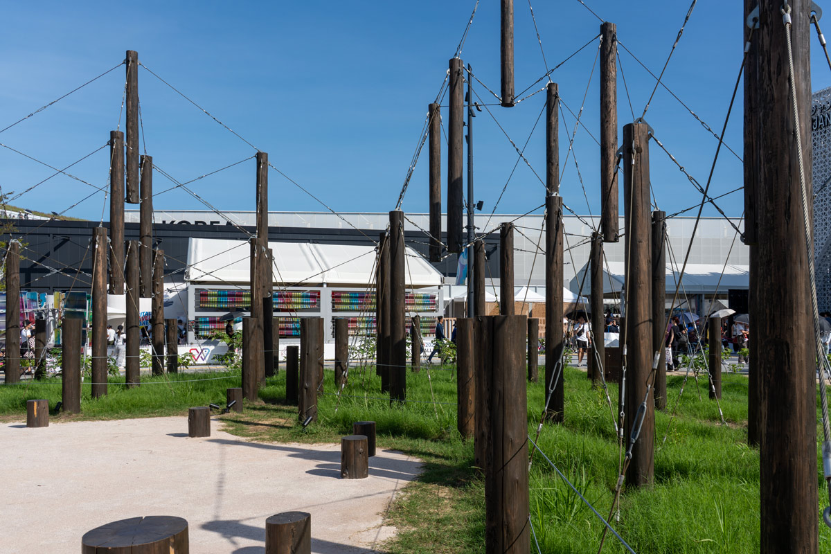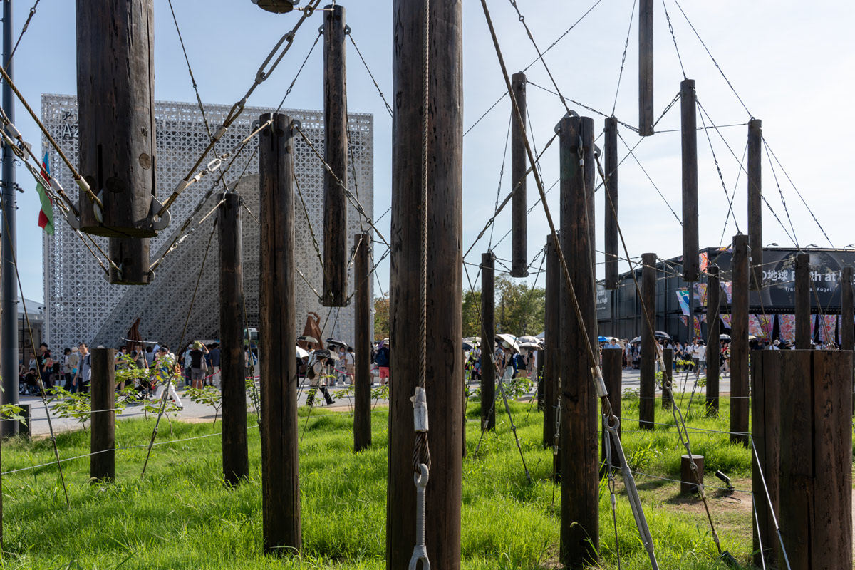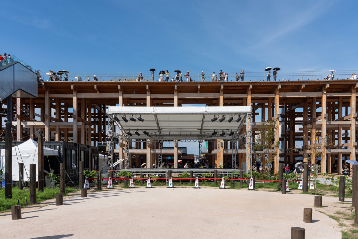 最小限の屋根とステージをアルミニウム合金造で軽くまとめ、周囲に未加工の丸太材を配して「森の空き地」のような囲みを生む。丸太は会期中に自然乾燥し、会期後に加工され建材として流通させる計画で、植栽された楮と合わせて、建築を素材循環のプロセスに組み込む。