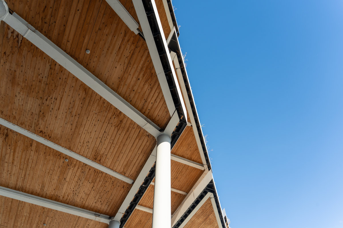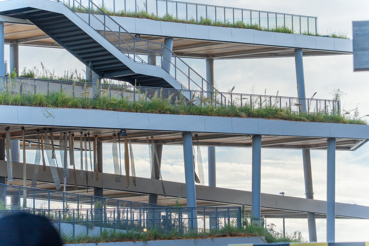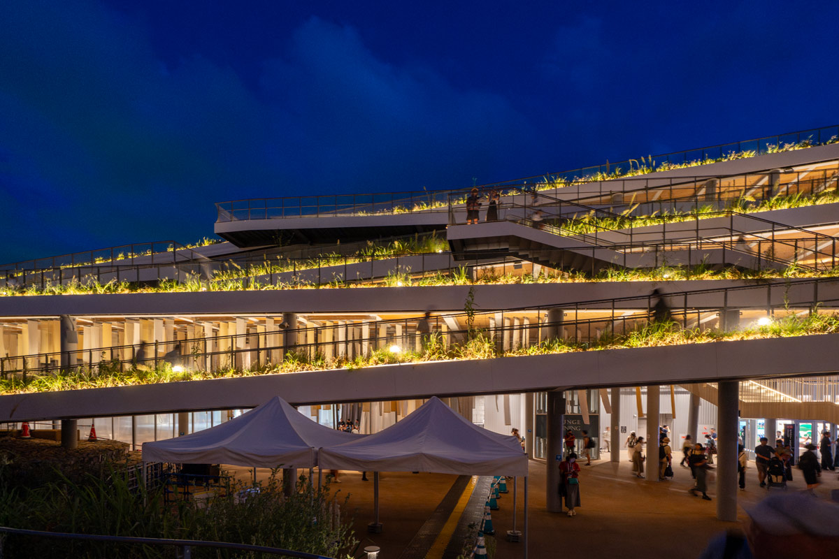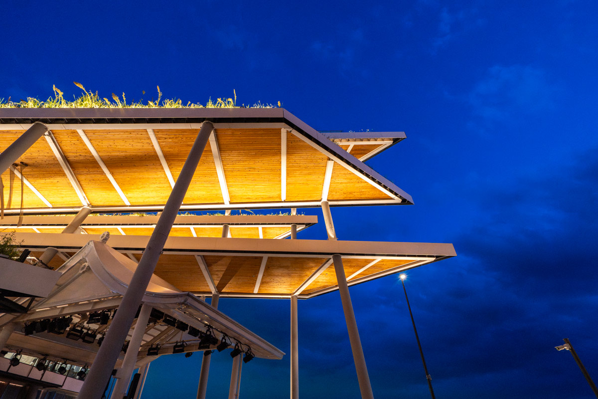 帯状スラブの重なりは、単なる意匠ではなく環境調停の仕組みとして機能する。斜めの向きが風を呼び込み、半屋外のラウンジや屋外ステージの快適性を高める。屋内外の境界を曖昧にすることで、式典の高揚感を広場へ、広場の熱気をステージへと相互に波及させる。構造的には鉄骨造を基盤とし、大スパンの要求と施工・運営の効率を両立。メンテナンス性と転換性に配慮した「器」としての合理が、祝祭建築の背骨を成している。