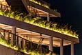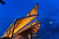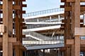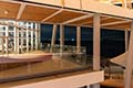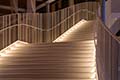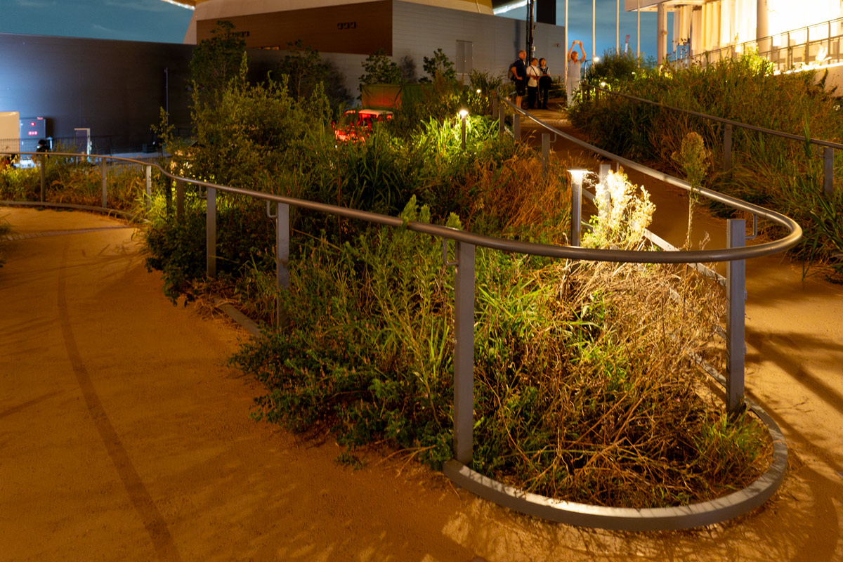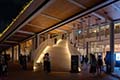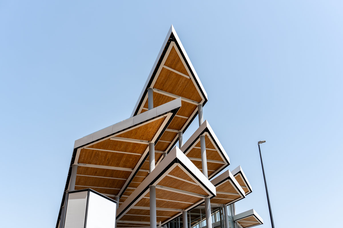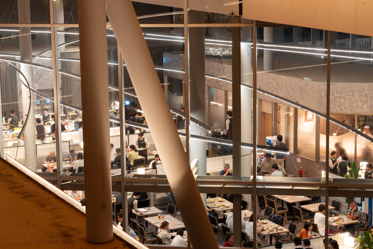 帯状スラブの重なりは、単なる意匠ではなく環境調停の仕組みとして機能する。斜めの向きが風を呼び込み、半屋外のラウンジや屋外ステージの快適性を高める。屋内外の境界を曖昧にすることで、式典の高揚感を広場へ、広場の熱気をステージへと相互に波及させる。構造的には鉄骨造を基盤とし、大スパンの要求と施工・運営の効率を両立。メンテナンス性と転換性に配慮した「器」としての合理が、祝祭建築の背骨を成している。