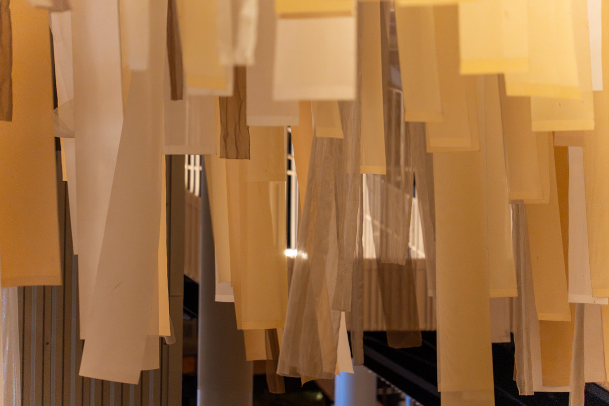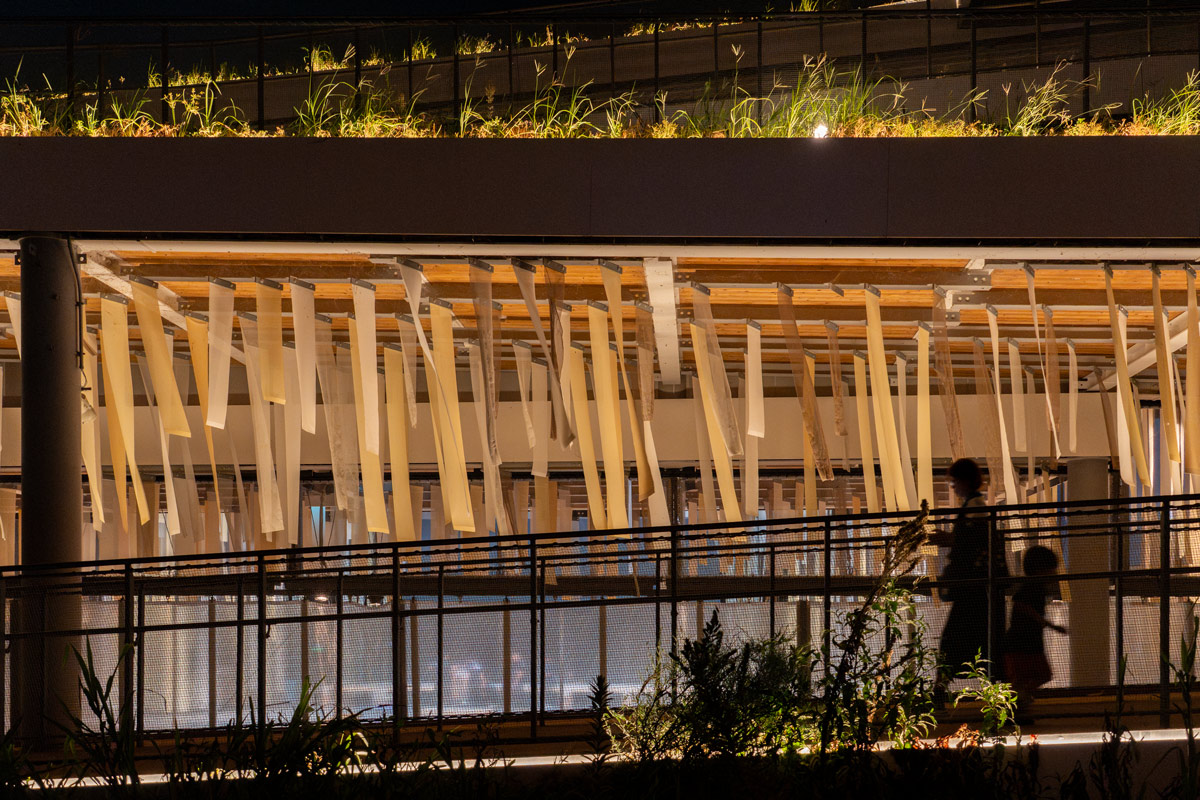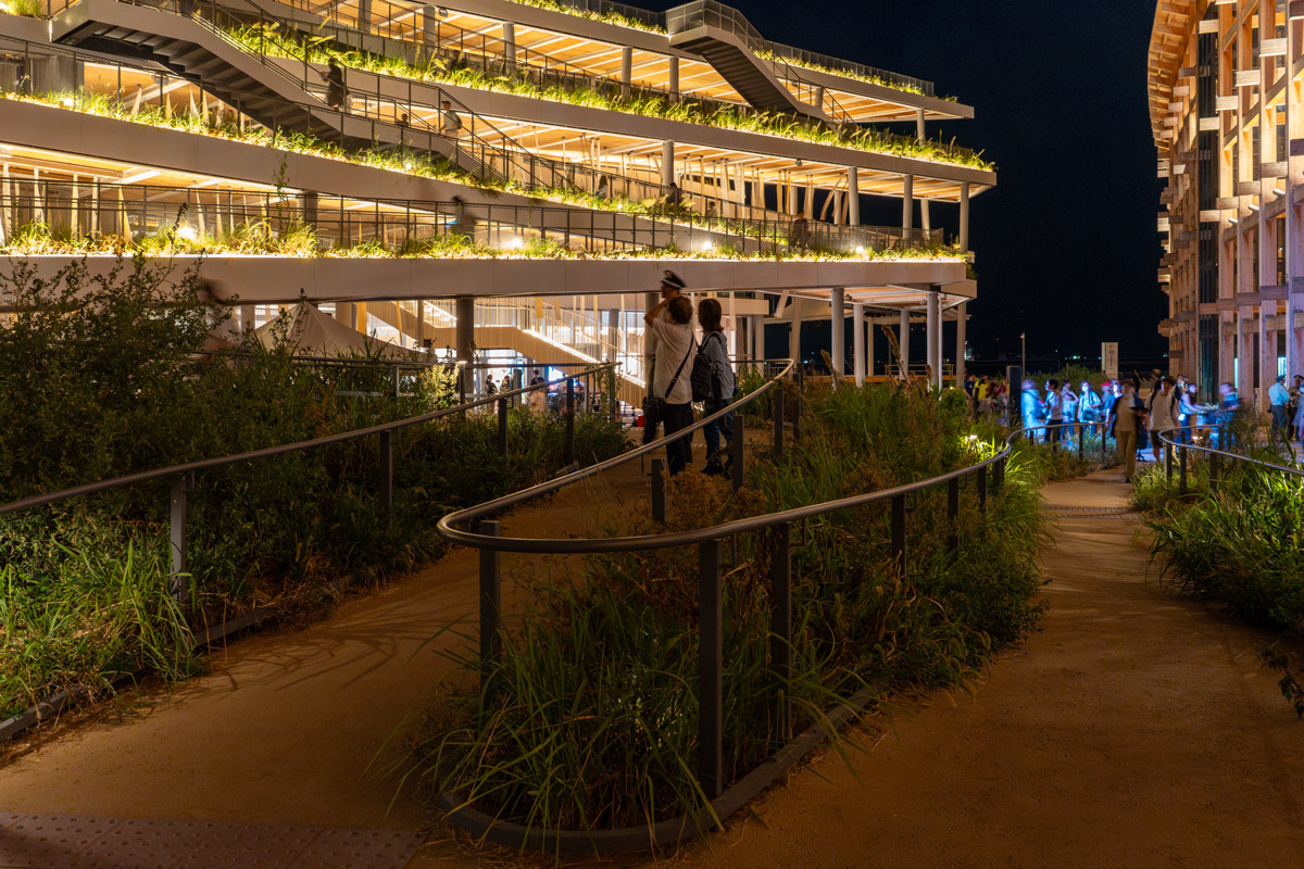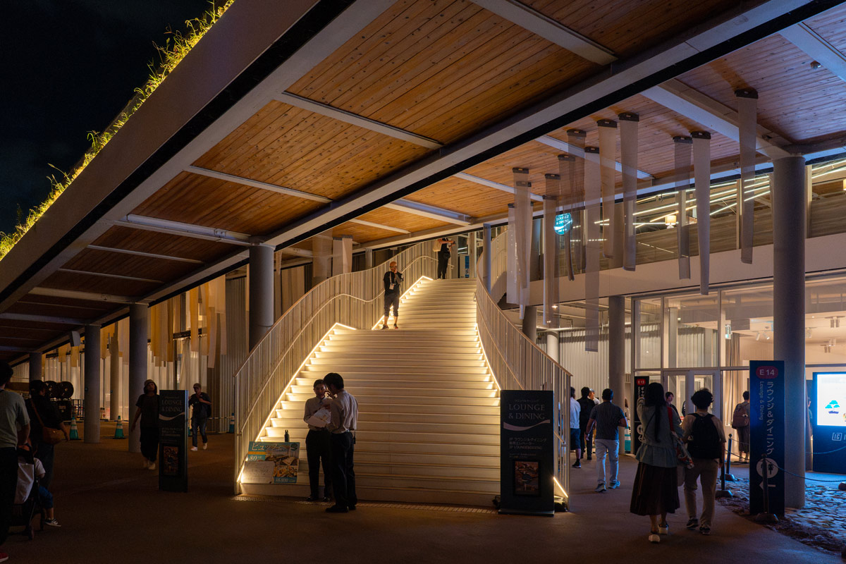 建物は帯状スラブの構成が最大の特徴で、スラブを敷地に対して斜めに配し、関西を貫く地形のしわや淀川水系へ抜ける定常風の向きと共鳴させることで、建築を「地理的生命体」として位置づけた。鉄骨造の軽やかな架構は、屋外の広がりと屋内の催事空間を連続させ、風・水・光を取り込む開放的な環境をつくる。床面積4,836.97㎡となり、会期中の多様なプログラム運営を想定した柔軟性が担保されている。