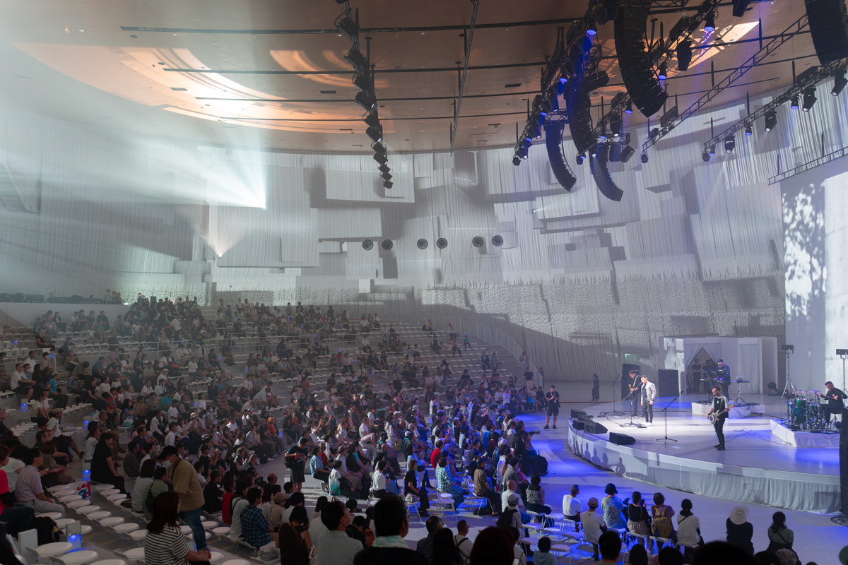 壁面は厚手の布をくねらせた白いカーテンで覆い、外側の屋根と繋がりを感じる金色の天井と白い床の全周にわたってプロジェクションマッピングを展開できる。