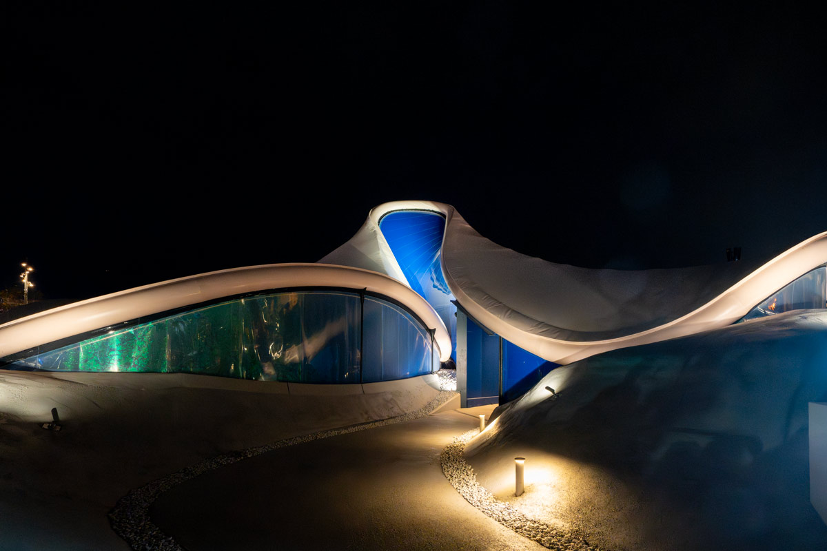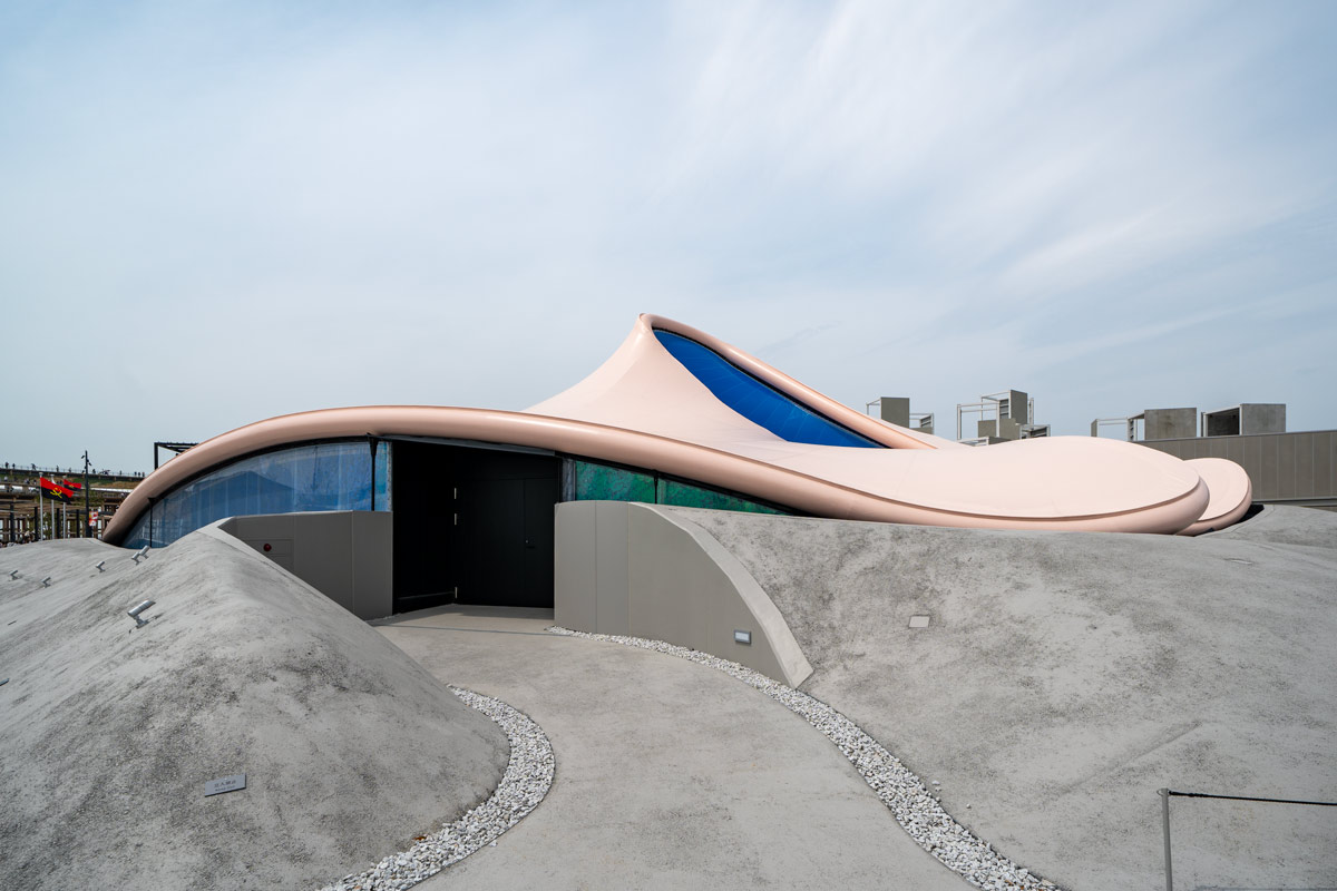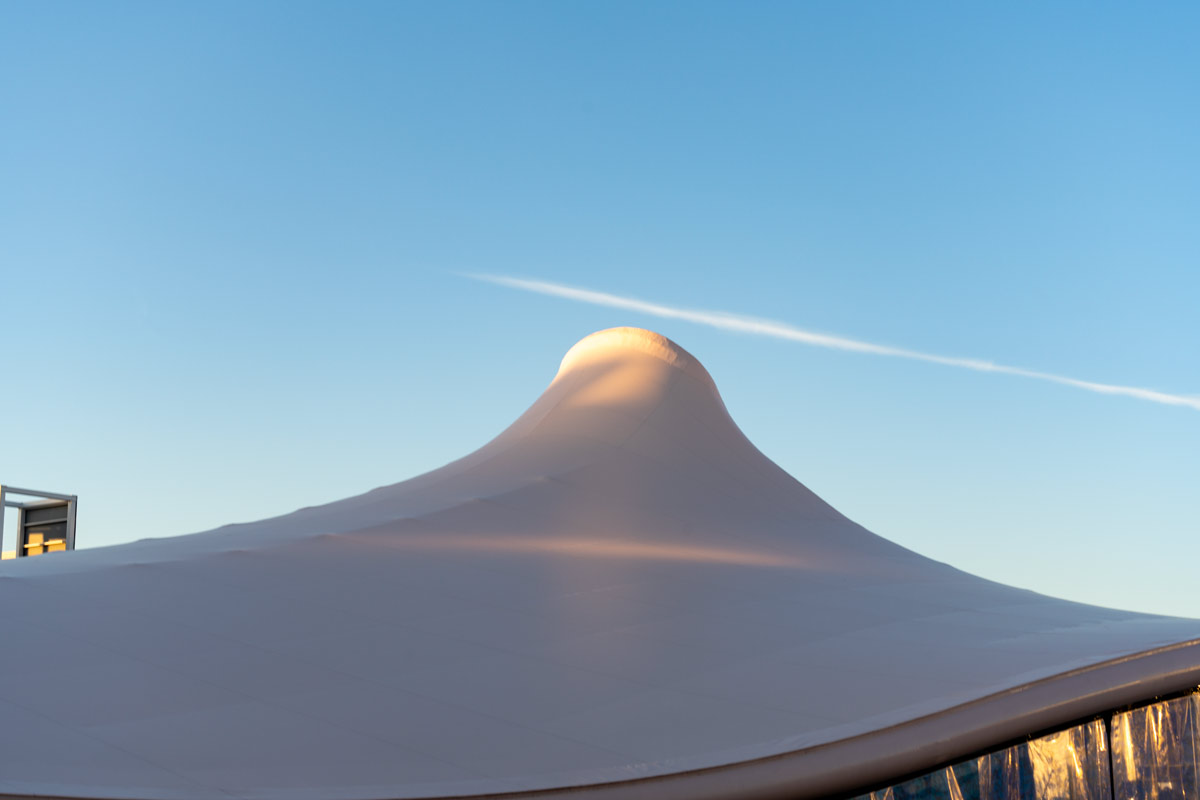 建築は「エンブリオ」と名づけられ、ペールピンクの膜屋根が大地に触れる寸前で浮遊する。リング状の鋼管と格子ケーブルによるテンション構造は、内部に柱を一本も持たず、25m超の無柱空間を成立させる。張力を段階的に導入して形状を追い込み、最小の部材で最大の空間効率を得ることで、資材とCO2の削減にも応える。軽くしなやかな屋根は風と光に応じて表情を変え、夜間は穏やかなライティングが曲面の連なりを強調する。