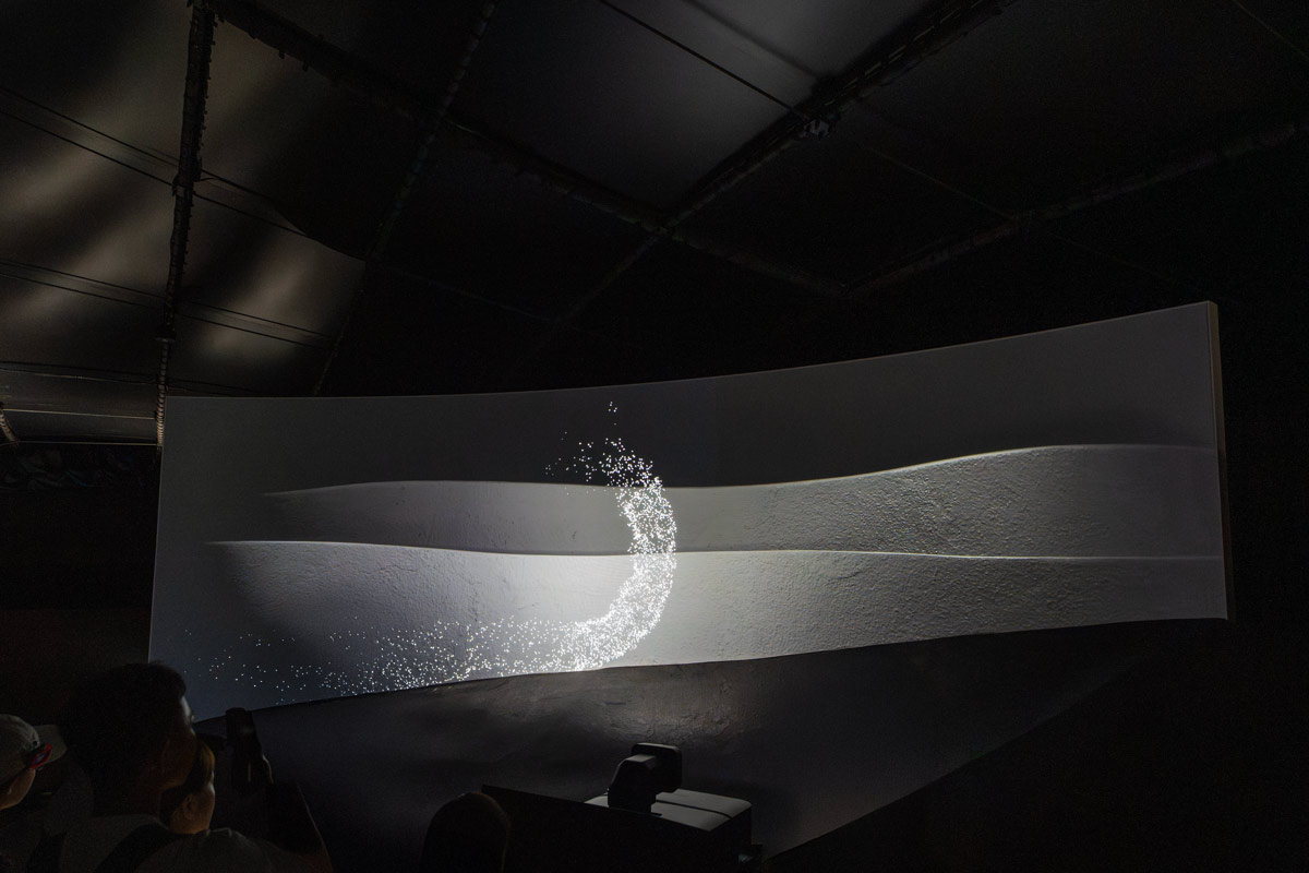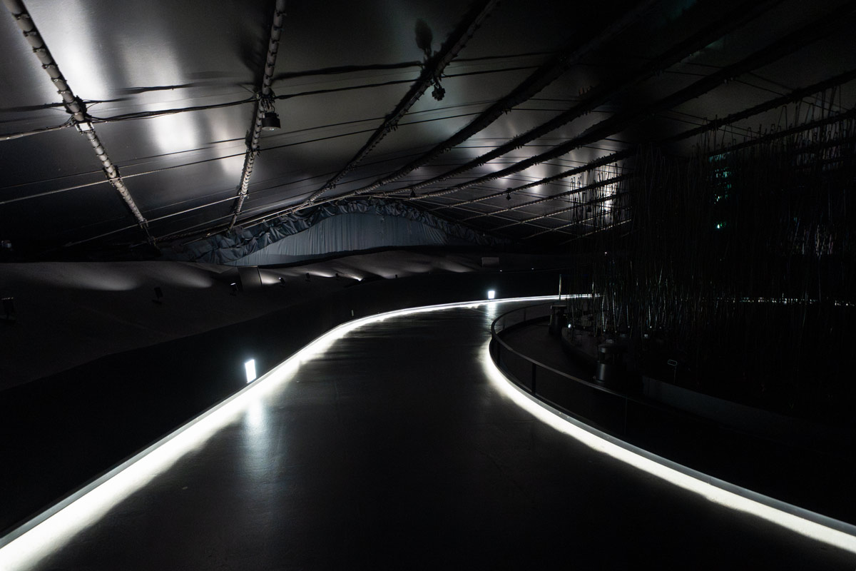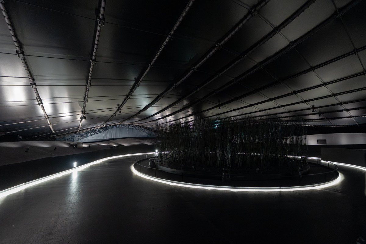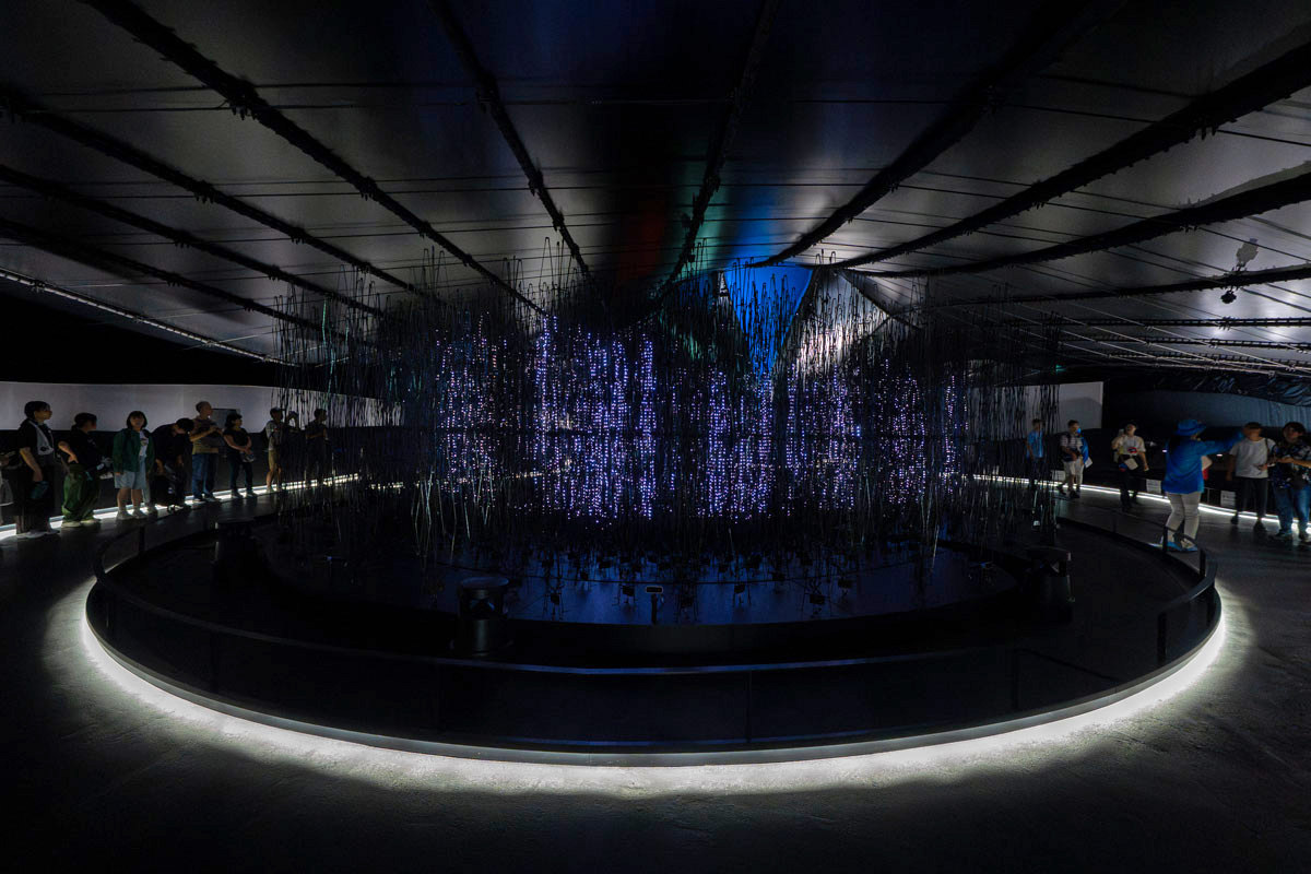 展示は「いのちを知る」。プロローグでは、破壊と再生の均衡としての動的平衡を短い映像とテキストで導入し、来場者の感覚を暗順応へ誘う。中心にはLED 320,000球を立体配列したシアター「クラスラ」が置かれ、微小な光粒による巨大な演算で38億年の生命史を描出する。個の自己保存だけでなく、共生や協力が進化を駆動してきた「利他の生命史」を、音と光のフィードバックで体感させる構成。環状に立ち上がる観覧場は誰もが同じ中心を共有し、建築の「ひとつながりの膜」と呼応して、来場者の視線を一つの現象へと集中させる。