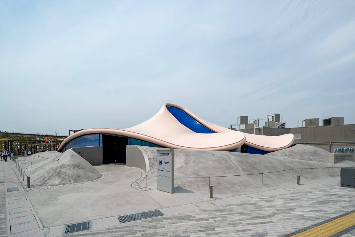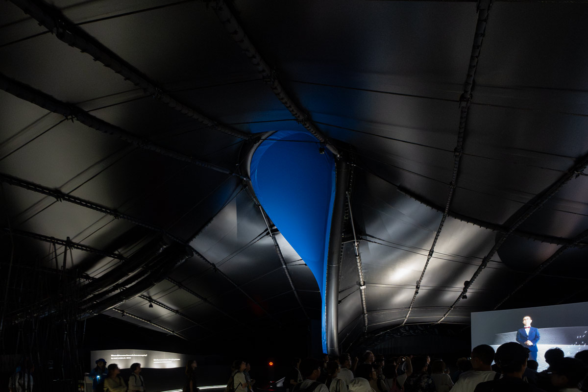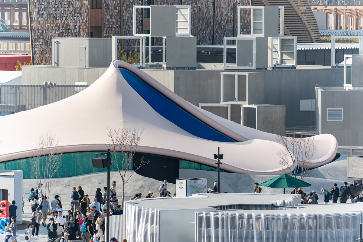 膜屋根とケーブルの平衡状態は、生命が自己と環境の交換で姿を保つ動的平衡の空間に落とし込んだ比喩的表現であり、展示の中核装置を包むワンルーム構成は、個別の経験を共通の中心に重ね合わせる。結果として、来場者は視覚と身体尺度の両方で「いのち」を学び直す。器と内容が一体でテーマを語る、このパビリオンの統合度こそが最大の見どころと言える。