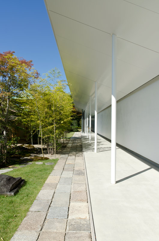 展示室出口とロビーを結ぶ白い回廊に庭園の木々の影が落ちる様は風情があり、インスタ映えするスポットとして人気になっている。
