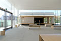 力強くせり出した大屋根の下にはガラスウォールに囲われた「広場」と名付けられた土間があり、ロビー・インフォメーション、そしてお茶と団子が楽しめる「あみじま茶屋」からなる、美術館の顔となる空間。