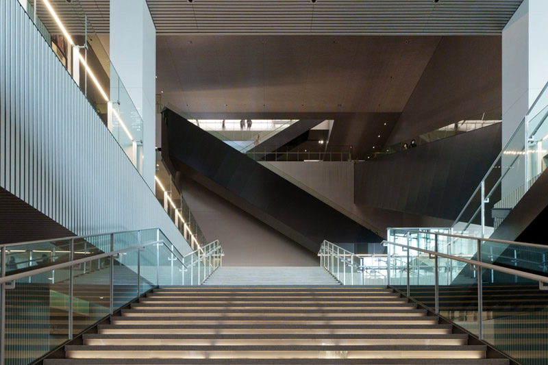 パッサージュは1階から5階まで吹き抜ける大空間に、1,2階をゆるやかに繋ぐ大きな階段や展示室へと伸びる長いエスカレーターが立体的に交差し、天井からは柔らかな自然光が降りそそぐ。