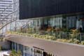 ガラスウォールに囲まれたメインの動線となる2階部分は、ふんだんに植栽の施された建物周囲の回廊や、敷地北側の堂島川に開けた芝生広場との繋がりを持たせ人々を誘う。