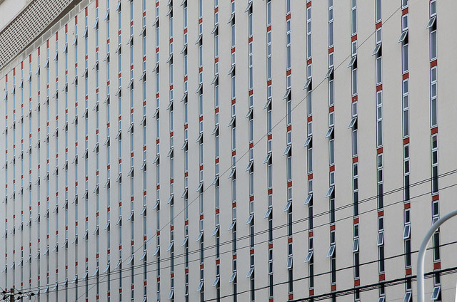 この建物の最大の特徴である縦長の窓が並ぶカーテンウォールは、長さ80メートルにもおよぶ。