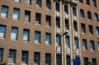 スクラッチタイルの施された外壁と、均等に並ぶ窓のスパニッシュスタイルの建物。