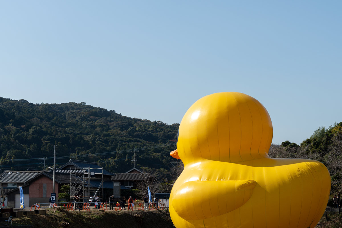 世界農業遺産の舞台でもあるため池に、祈りの里を象徴する山並みと集落を背後にして巨大なアヒルが浮かぶことで、「日常の風景」そのものが展示空間となり、来場者はラバーダックという非日常的なスケールのオブジェをきっかけに、普段は背景として見過ごしがちな水面や田畑、遠景の山や寺院との関係にあらためて目を向ける。