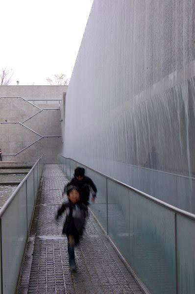 この水庭には、屋根上の水盤から大量の水が流れ落ちる、迫力のある滝が形成されており、水面を打つ轟音は外にまで鳴り響いている。