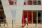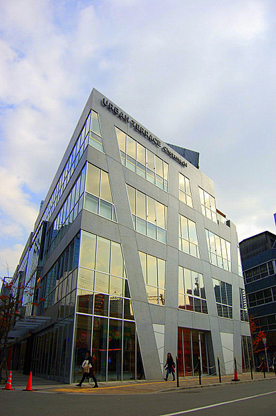 3棟で構成された路面店の集合体のような設計で、それぞれの棟の間には路地が設けられ、そこから突き出した出窓が印象的。